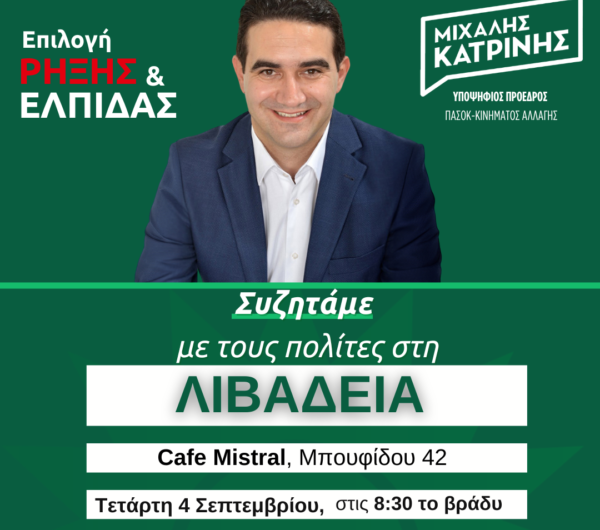 Ο υποψήφιος πρόεδρος του ΠΑΣΟΚ Μιχάλης Κατρίνης επισκέπτεται την Τετάρτη 4 Σεπτεμβρίου την Λιβαδειά, συνεχίζοντας την επικοινωνία του...