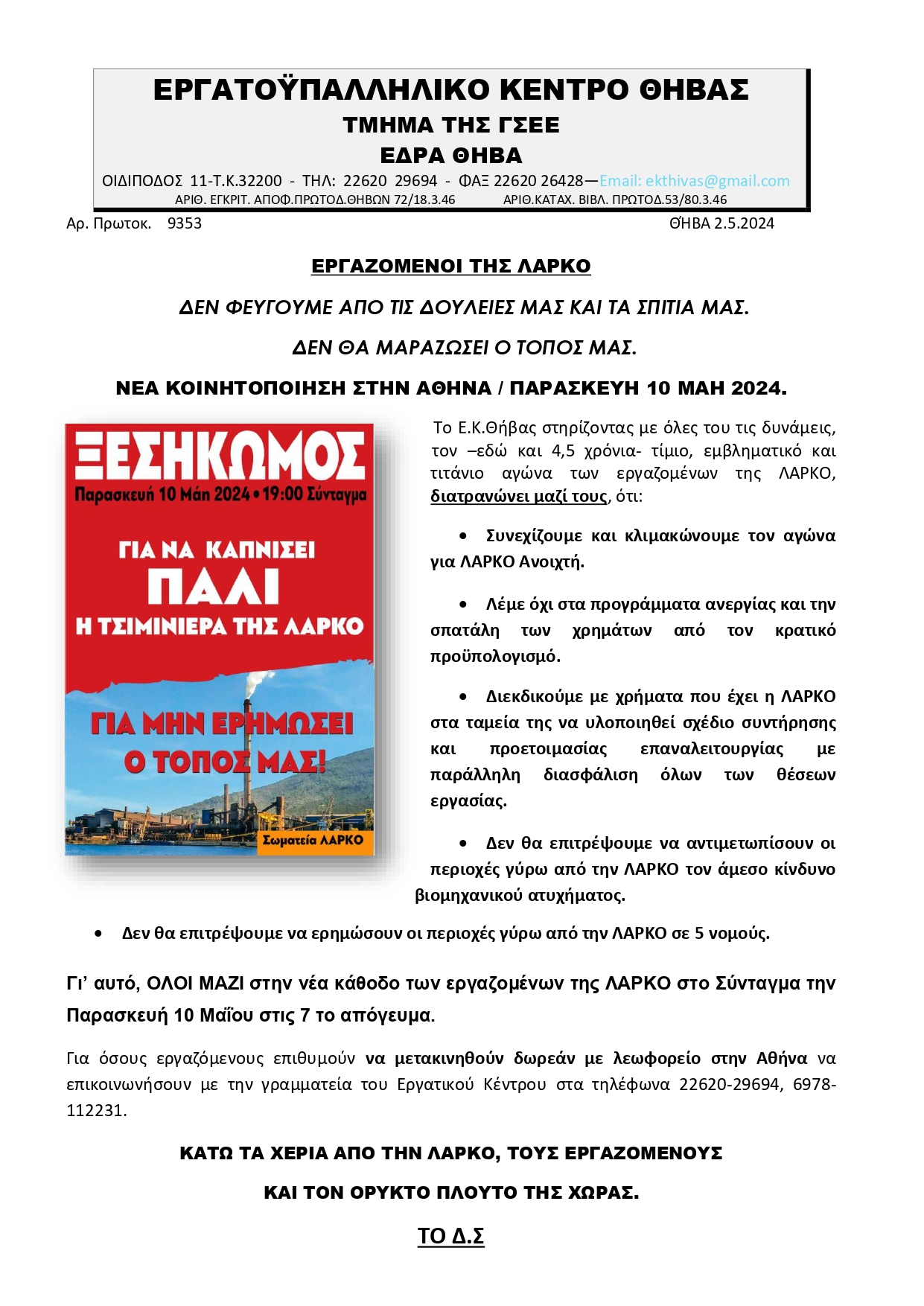 Το Εργατοϋπαλληλικό Κέντρο Θήβας, εξέφρασε την συμπαράστασή του προς τους εργαζόμενους στη ΛΑΡΚΟ, την Δευτέρα 11 Δεκεμβρίου...