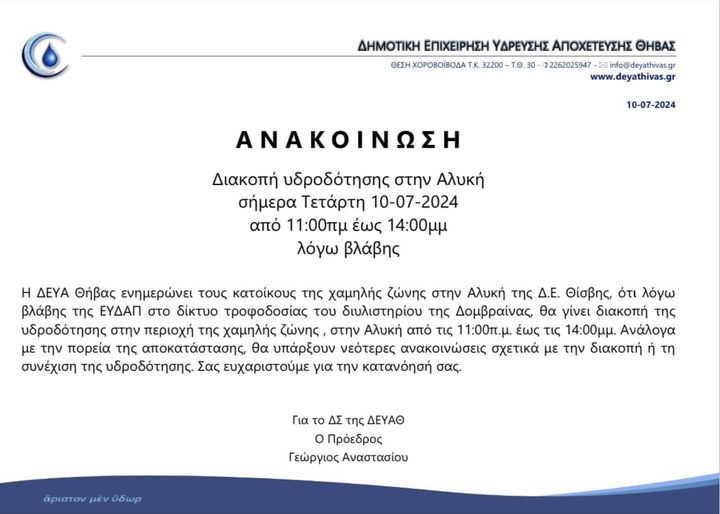Έκτακτα μέτρα για την υδροδότηση της Αλυκής του Δήμου Θηβαίων Θ͟͞ή͟͞β͟͞α͟͞ Έκτακτα μέτρα για την υδροδότηση της Αλυκής του Δήμου Θηβαίων admin 6 Ιουλίου, 2023 Η ΔΕΥΑ Θήβας ενημερώνει τους κατοίκους του οικισμού της Αλυκής του Δήμου Θηβαίων, ότι λόγω της συνεχιζόμενης...Read More