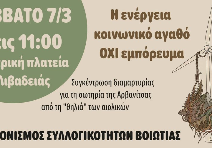 Συγκέντρωση Διαμαρτυρίας για τη διάσωση της ΑΡΒΑΝΙΤΣΑΣ από τα αιολικά Ε͟κ͟δ͟η͟λ͟ώ͟σ͟ε͟ι͟ς͟ Συγκέντρωση Διαμαρτυρίας για τη διάσωση της ΑΡΒΑΝΙΤΣΑΣ από τα αιολικά admin 19 Φεβρουαρίου, 2026 ΟΧΙ ΚΑΙ ΣΤΗΝ ΑΡΒΑΝΙΤΣΑ !!! ΣΥΓΚΕΝΤΡΩΣΗ ΔΙΑΜΑΡΤΥΡΙΑΣ ΓΙΑ ΤΗ ΔΙΑΣΩΣΗ ΤΗΣ ΑΡΒΑΝΙΤΣΑΣ ΑΠΟ ΤΑ ΑΙΟΛΙΚΑ ΣΑΒΒΑΤΟ 7...Read More
