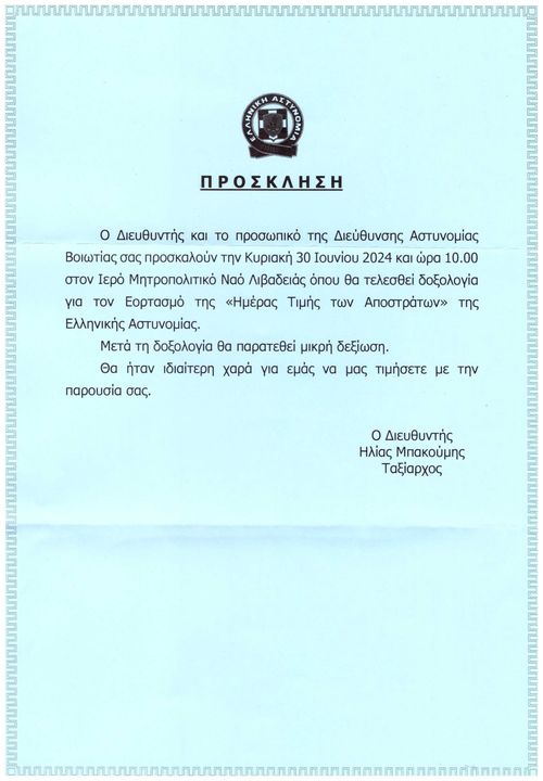 Η Αστυνομία τιμάει τους απόστρατους Β͇ο͇ι͇ω͇τ͇ί͇α͇ Η Αστυνομία τιμάει τους απόστρατους admin 26 Ιουνίου, 2024 Σας ενημερώνουμε ότι, την ΚΥΡΙΑΚΗ 30 Ιουνίου 2024 στον Ιερό Μητροπολιτικό Ναό Λιβαδειάς, πραγματοποιείται η εκδήλωση, προς...Read More