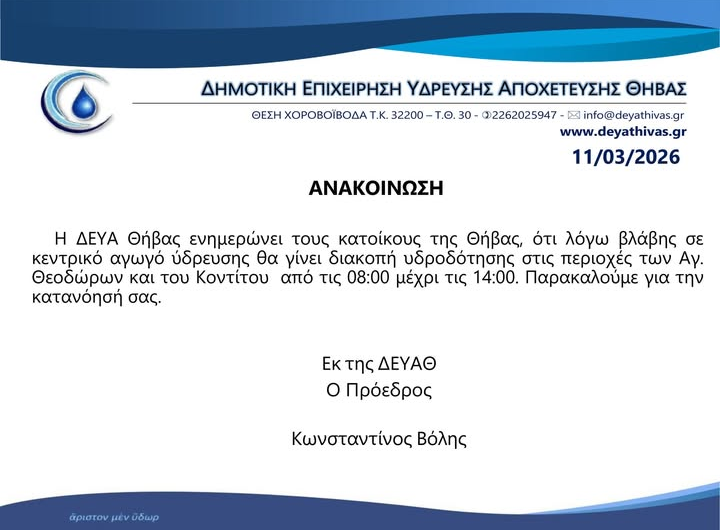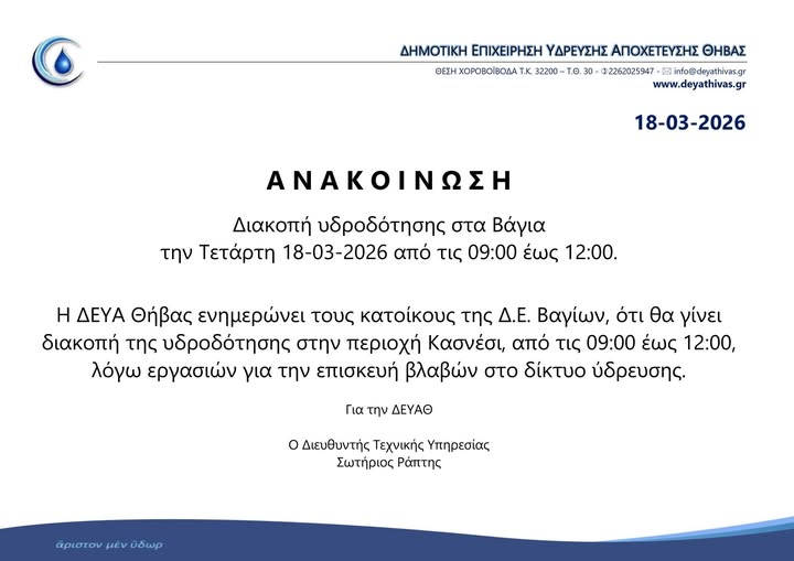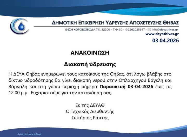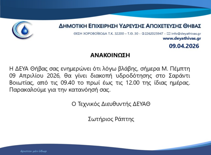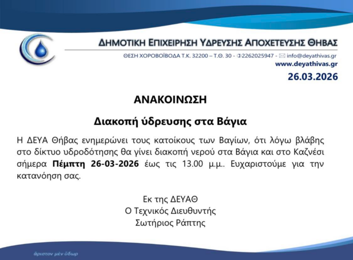 ΔΕΥΑΘ:Διακοπή υδροδότησης στα Βάγια Θ͟͞ή͟͞β͟͞α͟͞ ΔΕΥΑΘ:Διακοπή υδροδότησης στα Βάγια admin 7 Απριλίου, 2026 Read More