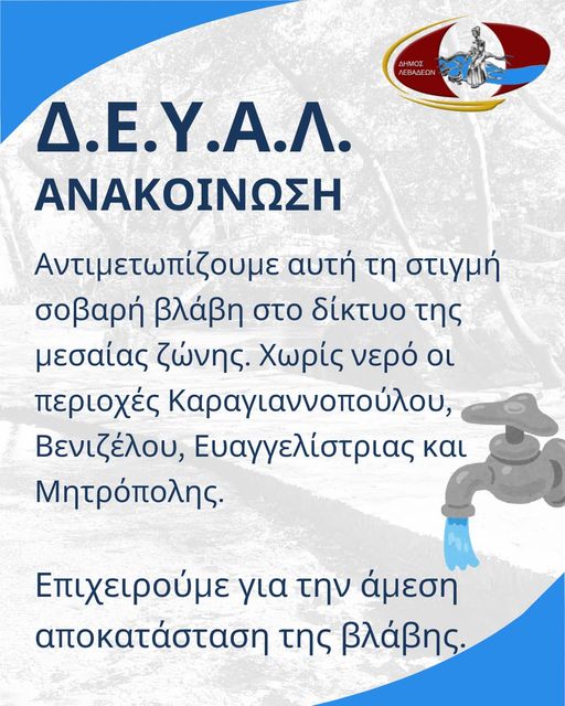 Αντιμετωπίζουμε αυτή τη στιγμή σοβαρή βλάβη στο δίκτυο της μεσαίας ζώνης. Χωρίς νερό οι περιοχές Καραγιαννοπούλου, Βενιζέλου,...