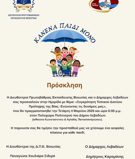 Ημερίδα για την πρόληψη της βίας με μήνυμα «Κανένα παιδί μόνο» Ε͟κ͟δ͟η͟λ͟ώ͟σ͟ε͟ι͟ς͟ Ημερίδα για την πρόληψη της βίας με μήνυμα «Κανένα παιδί μόνο» admin 27 Μαρτίου, 2026 📣 ΚΑΝΕΝΑ ΠΑΙΔΙ ΜΟΝΟ 🤝 Ο Δήμος Ορχομενού, σε συνεργασία με τη Διεύθυνση Πρωτοβάθμιας Εκπαίδευσης Βοιωτίας, σας...Read More