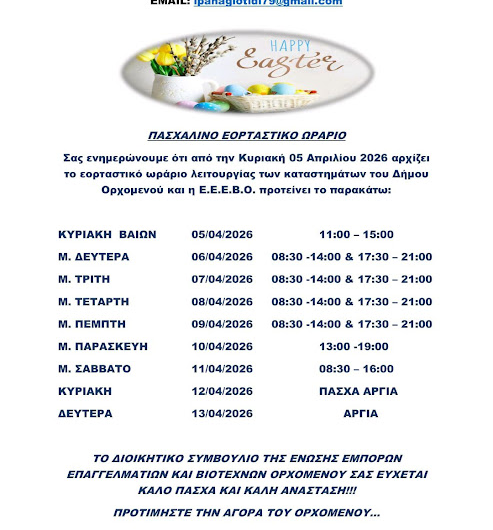 Ένωση Ε.Ε.Β. Ορχομενού : Το εορταστικό ωράριο για τις αγορές του Πάσχα Β͇ο͇ι͇ω͇τ͇ί͇α͇ Ένωση Ε.Ε.Β. Ορχομενού : Το εορταστικό ωράριο για τις αγορές του Πάσχα admin 6 Απριλίου, 2026 Read More