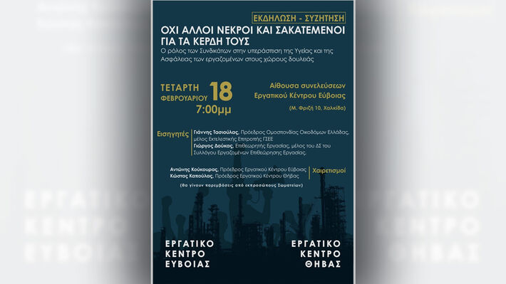 Εκδήλωση – συζήτηση με θέμα «Όχι άλλοι νεκροί και σακατεμένοι για τα κέρδη τους. Ο ρόλος των...