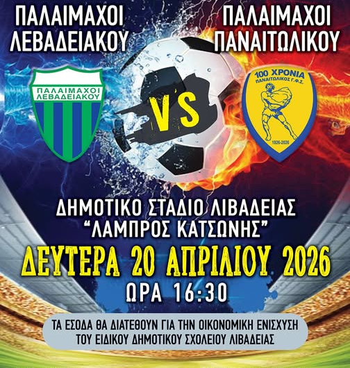 Ενίσχυση του Ειδικού Δημοτικού Σχολείου Λιβαδειάς Β͇ο͇ι͇ω͇τ͇ί͇α͇ Ενίσχυση του Ειδικού Δημοτικού Σχολείου Λιβαδειάς admin 19 Απριλίου, 2026 ⚽️Ο Δήμος Λεβαδέων στηρίζει τον φιλικό αγώνα παλαιμάχων «Κώστας Γκαλαμέλος», ανάμεσα στους παλαίμαχους Λεβαδειακού και Παναιτωλικού, που...Read More