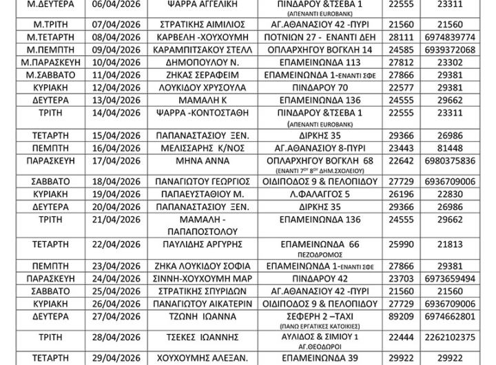 ΚΥΡΙΑΚΗ 01/12/2024 ΠΑΠΑΕΥΣΤΑΘΙΟΥ Μ. Λ.ΦΑΛΑΓΓΟΣ 5 26196 22830 ΔΕΥΤΕΡΑ 02/12/2024 ΠΑΠΑΝΑΣΤΑΣΙΟΥ ΞΕΝ. ΔΙΡΚΗΣ 35 29366 26986 ΤΡΙΤΗ...
