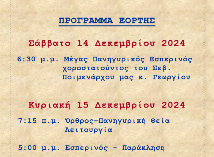 Την Πέμπτη 12 Δεκεμβρίου 2024 ο Σεβασμιώτατος Ποιμενάρχης μας κ. Γεώργιος τέλεσε τη Θεία Λειτουργία στον Ιερό...